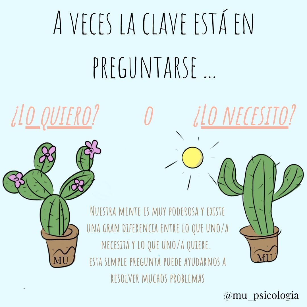 En ocasiones muchas de las personas con las que hablo o veo en consulta tienen dificultades para diferenciar lo que necesitan de lo que quieren. A simple vista puede parecer una diferencia insignificante; sin embargo, desde el punto de vista p sicológico, el impacto que genera es distinto. Si me digo "necesito....", este pensamiento va asociado a una serie de emociones que pueden llegar a provocar mucho malestar y daño (por ejemplo, ansiedad, frustración, culpa...), cuando en realidad podríamos cambiar esta palabra por "quiero..." que le da un significado completamente diferente: un proyecto de futuro, un refuerzo, algo que puede ser positivo para mí pero no es tan negativo si no llega a ocurrir. "Necesitar" implica que si no lo alcanzas va a tener unas consecuencias muy negativas, por ejemplo, un cactus necesita al sol sino moriría, al igual que nos pasa a nosotros con el agua. Sin embargo, si lo "quieres" significa que puedes intentarlo y que si lo consigues, supondrá un añadido positivo en tu vida, pero que si no lo logras, no pasa nada, puedes vivir sin ello. Por ejemplo, no es lo mismo decir "necesito tener pareja", a "quiero tener pareja". Por eso es tan importante observar qué es lo que nos decimos a nosotros mismos puesto que muchas veces esto marcará la diferencia. Puede parecer sencillo, pero resulta muy difícil, en determinadas situaciones, ver esa diferencia.